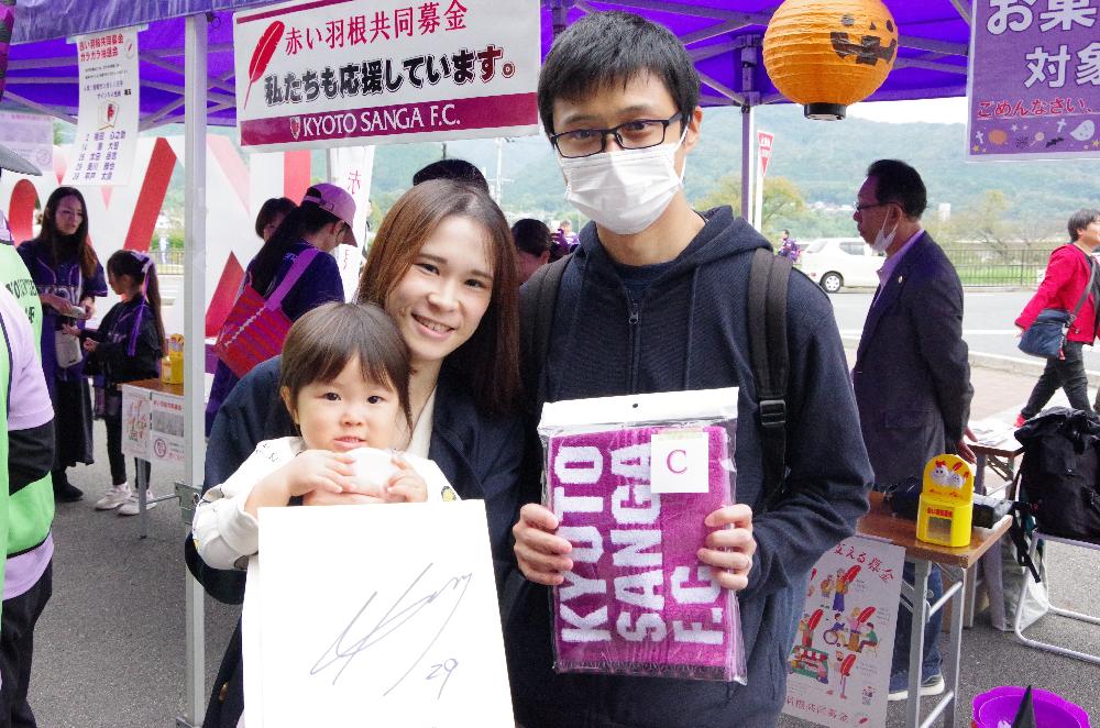 10月25日(土)京都サンガF.C.対鹿島アントラーズ戦にて街頭募金を実施しました。募金いただいた方にサイン入り色紙や京都サンガF.C.×共同募金のコラボステッカーがもらえるガラガラ抽選会を実施しました。福岡慎平選手にも募金活動にご協力いただき193,128円の募金が集まりました。集まった募金は亀岡の地域福祉の推進に使われます。ご協力いただきありがとうございました。