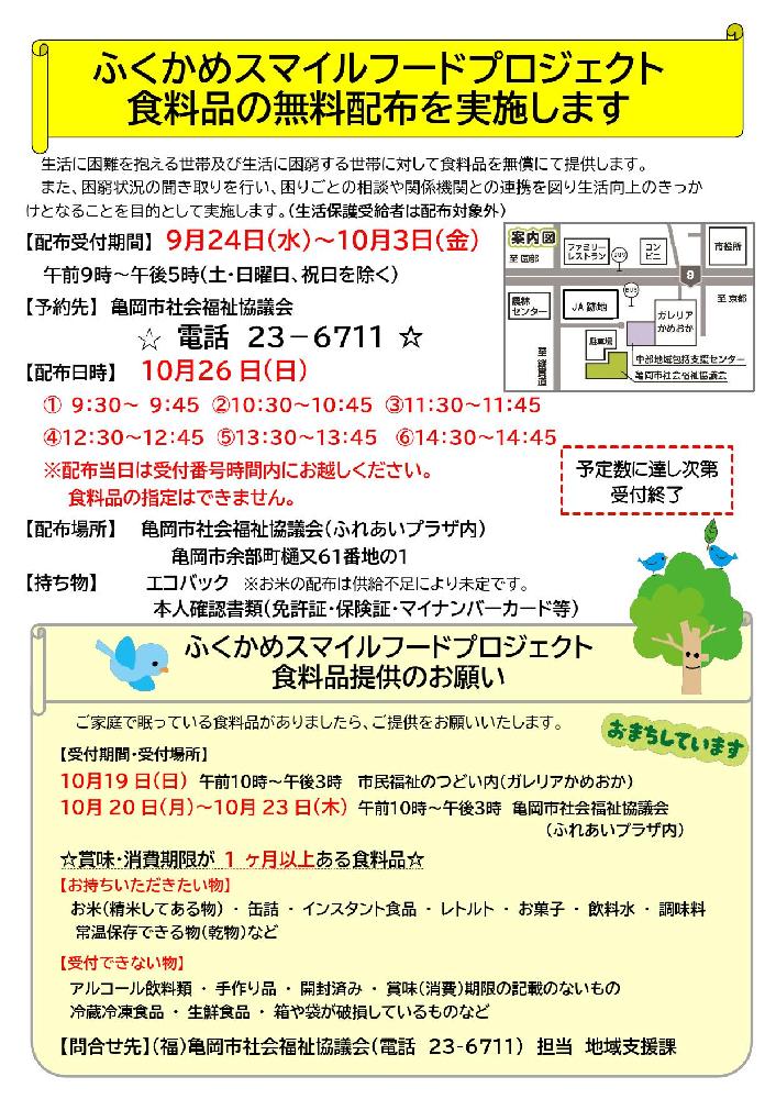 昨年度に続き今年度も「ふくかめスマイルフードプロジェクト」を開催します。食料品配布を希望される方の申し込みは9月24日~10月3日(土日祝除く9時~17時)までの期間となっています。また、10月19日~23日まで食料品提供の受付をいたします。詳細は下記チラシをご確認いただき、亀岡市社協までお問い合わせください。(23-6711)ご協力をお願いいたします。